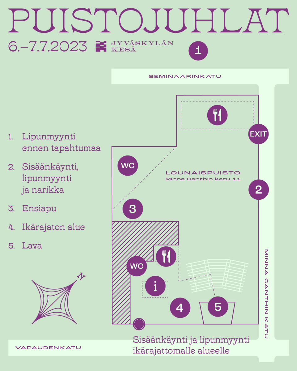Festivaalialueen sisäänkäynti lipunmyynti-, rannekkeenvaihto- ja rannekkeentarkastuspisteineen sijaitsee Minna Canthin kadulla, Seminaarinkadun kulmauksessa. Minna Canthin katu on osa Puistojuhlien tapahtuma-aluetta. Tapahtuma-aikana Minna Canthin katu suljetaan yleiseltä liikenteeltä Seminaarinkadun ja Vapaudenkadun väliseltä osuudelta. Lisäksi Seminaarinkatu suljetaan yleiseltä liikenteeltä Vaasankadun ja Hämeenkadun väliseltä osuudelta.