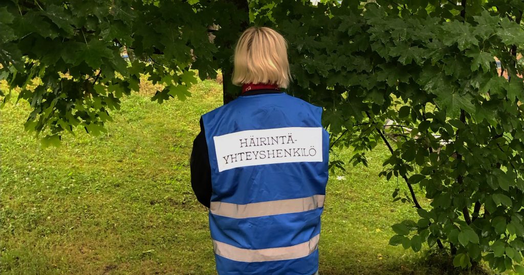Festivaalialueella päivystää häirintäyhteyshenkilö, joka on tukihenkilö, jonka puoleen voi kääntyä, mikäli kokee tulleensa tapahtumassa häirityksi. Häirintäyhteyshenkilö ei ole viranomainen, ja rikosta epäiltäessä on aina otettava yhteys poliisiin. Puistojuhlien ajan häirintäyhteyshenkilö päivystää Lounaispuistossa ensiaputeltan lähellä. Häirintäyhteyshenkilönä toimii Fanni Rantala. Tunnistat hänet sinisestä liivistä, jonka selkäpuolella lukee häirintäyhteyshenkilö.